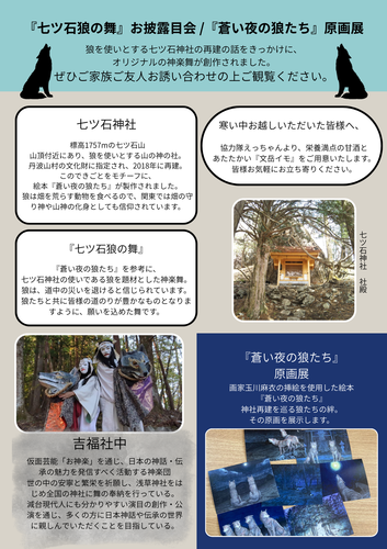 このたび、狼伝承を題材にした絵本『蒼い夜の狼たち』から着想を得て創作された神楽を、地域文化の紹介および観光振興の一環として披露します。本神楽は、伝承や物語の世界観を舞台芸能として表現したものであり、信仰行為を目的とするものではありません。