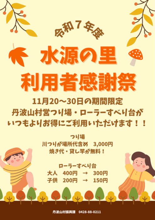 トップ > お知らせ(観光) > 令和7年度水源の里施設利用者感謝祭の開催について